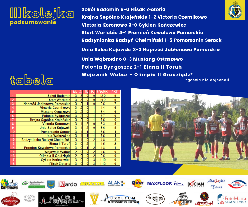 W III kolejce rozgrywek Victoria Koronowo zagra u siebie z Cyklonem Kończewice. Mecz ma Stadionie Miejskim w Koronowie odbędzie się 15 sierpnia, o godzinie 16:00.