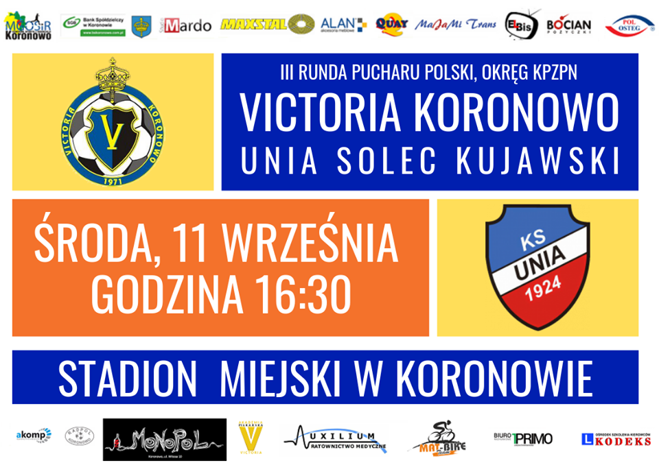 Wielkie emocje w Koronowie, niestety kończyny przygodę w Pucharze Polski. Po dogrywce lepsza KS Unia Solec Kujawski, w regulaminowym czasie gry remis 2:2. Bramki dla Victorii Adrian Bielawski i Damian Stasikowski