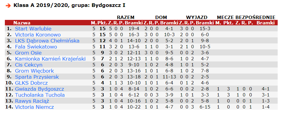 Po sześciu kolejkach, z kompletem 18 punktów Victoria zostaje samodzielnym liderem A-klasy, drugi jest Start Warlubie - 16 pkt., trzecia Fala Świekatowo, punktów 14.