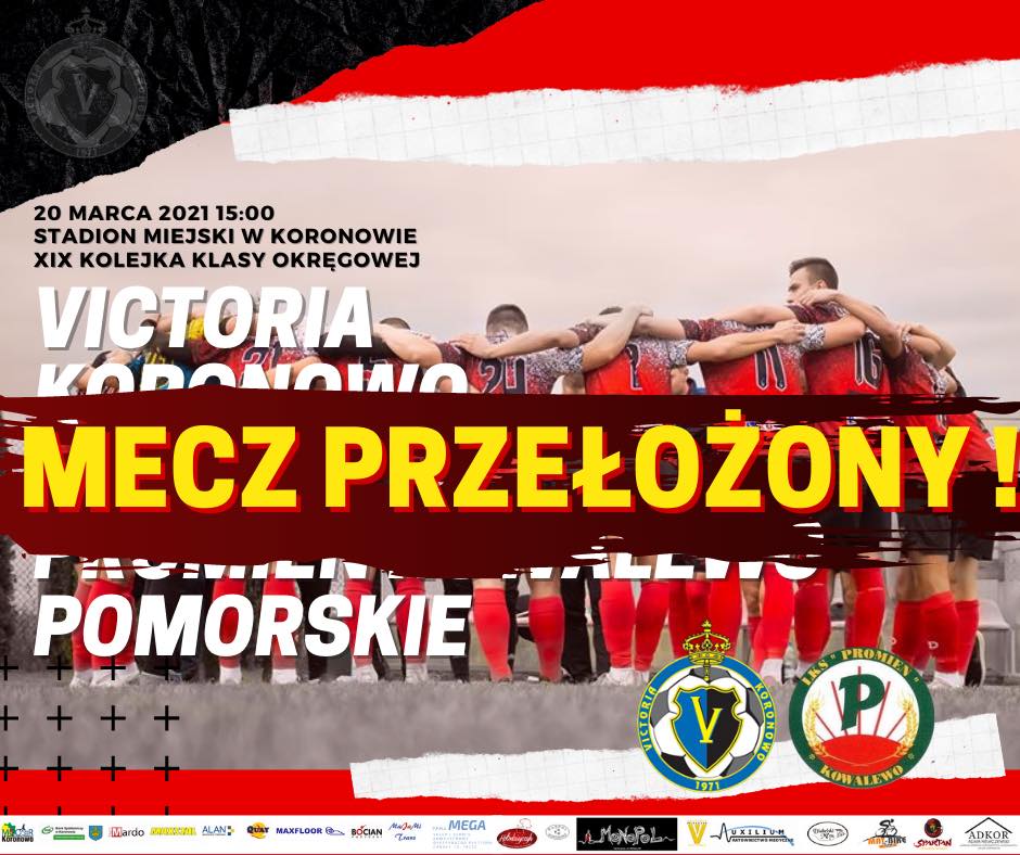 Z przykrością informujemy, że ze względu na wprowadzane od 20 marca 2021r obostrzenia sanitarne obejmujące teren całego kraju, mecz z Promieniem Kowalewo Pomorskie zostaje przełożony na termin bliżej nieokreślony.