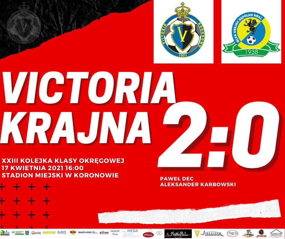 Zwyciężamy z Krajną Sępólno Krajeńskie 2:0. Bramki dla Victorii zdobyli Paweł Dec i Olek Karbowski.
